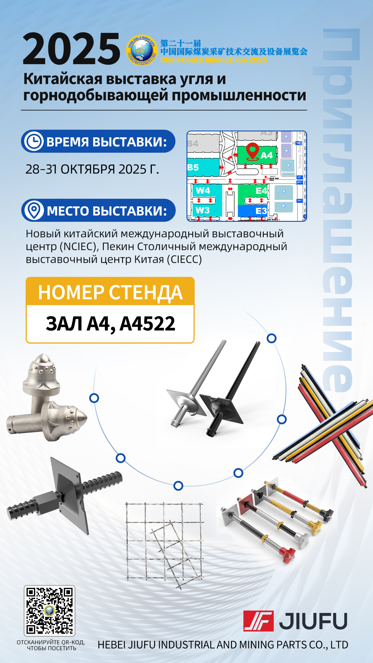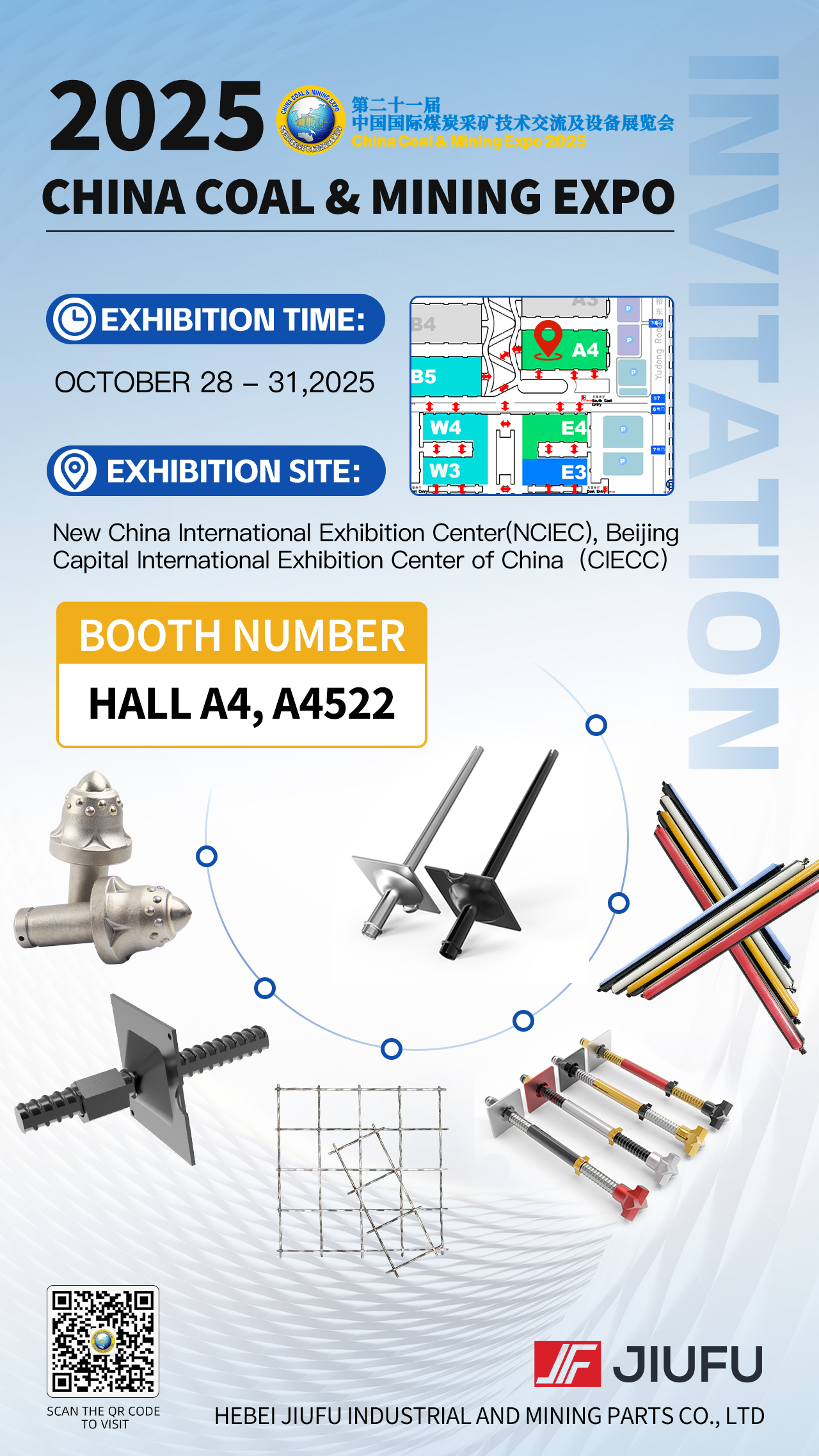 Hebei Jiufu Mining Accessories Co., Ltd. sincerely invites you to visit the 2025 China International Coal Mining Technology Exchange and Equipment Exhibition, to be held at the China International Exhibition Center in Beijing from October 28 to 31, 2025. We will be at Booth 522, Hall A4, to explore cutting-edge industry technologies and collaborate on future development.